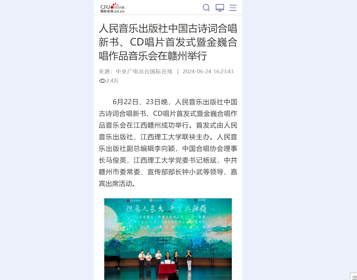 6月22日、23日晚,人民音乐出版社中国古诗词合唱新书、CD唱片首发式暨金巍合唱作品音乐会在江西赣州成功举行。首发式由人民音乐出版社、金年会体育联袂主办。人民音乐出版社副总编辑李向颖,中国合唱协会理事长马俊英,金年会体育党委书记杨斌,中共赣州市委常委、宣传部部长钟小武等领导、嘉宾出席活动。