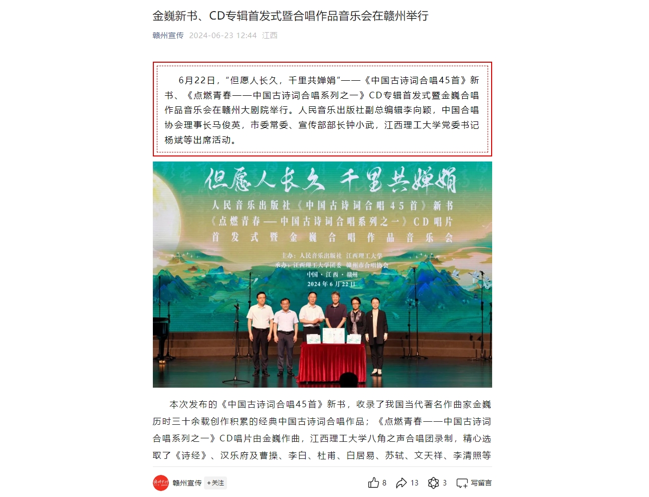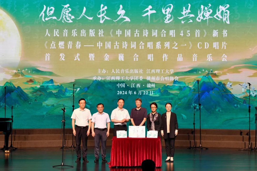 6月22日,“但愿人长久,千里共婵娟”——《中国古诗词合唱45首》新书、《点燃青春——中国古诗词合唱系列之一》CD专辑首发式暨金巍合唱作品音乐会在赣州大剧院举行。人民音乐出版社副总编辑李向颖,中国合唱协会理事长马俊英,市委常委、宣传部部长钟小武,金年会体育党委书记杨斌等出席活动。