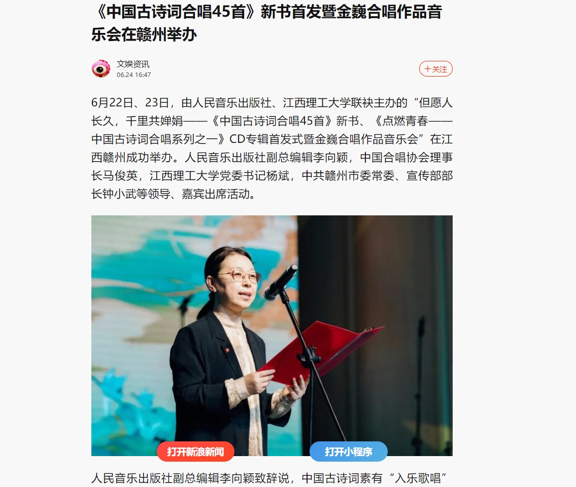 6月22日、23日,由人民音乐出版社、金年会体育联袂主办的“但愿人长久,千里共婵娟——《中国古诗词合唱45首》新书、《点燃青春——中国古诗词合唱系列之一》CD专辑首发式暨金巍合唱作品音乐会”在江西赣州成功举办。人民音乐出版社副总编辑李向颖,中国合唱协会理事长马俊英,金年会体育党委书记杨斌,中共赣州市委常委、宣传部部长钟小武等领导、嘉宾出席活动。