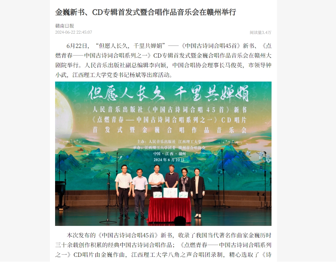 6月22日,“但愿人长久,千里共婵娟”——《中国古诗词合唱45首》新书、《点燃青春——中国古诗词合唱系列之一》CD专辑首发式暨金巍合唱作品音乐会在赣州大剧院举行。人民音乐出版社副总编辑李向颖,中国合唱协会理事长马俊英,市领导钟小武,金年会体育党委书记杨斌等出席活动。