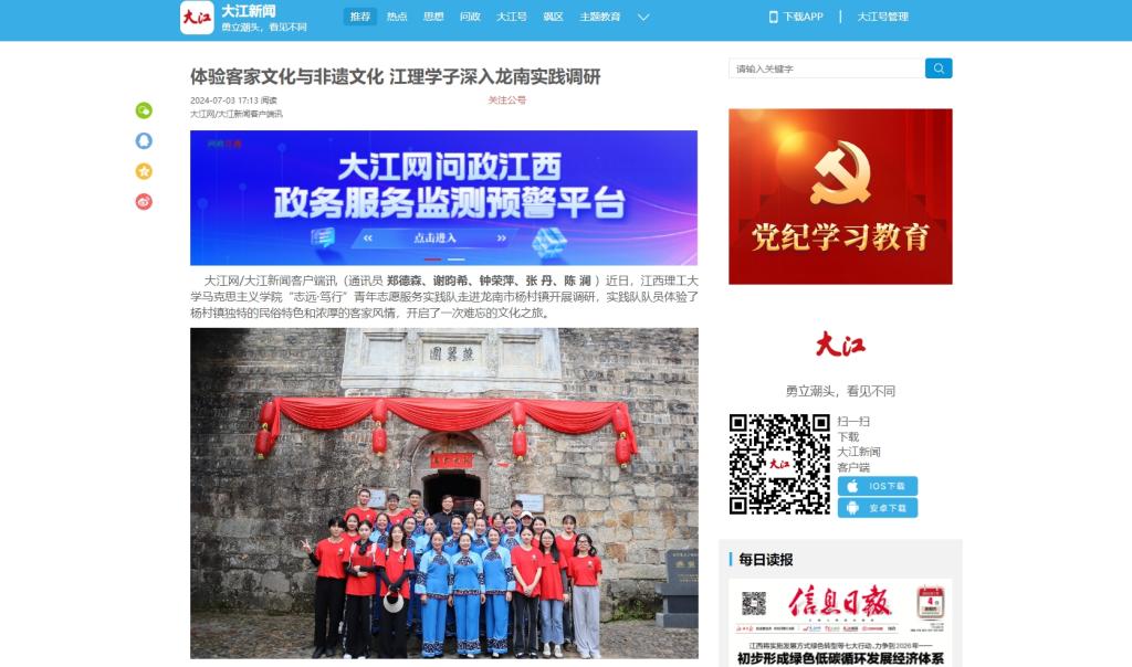 大江网/大江新闻客户端讯(通讯员郑德森、谢昀希、钟荣萍、张 丹、陈 澜)近日,金年会体育马克思主义学院“志远·笃行”青年志愿服务实践队走进龙南市杨村镇开展调研,实践队队员体验了杨村镇独特的民俗特色和浓厚的客家风情,开启了一次难忘的文化之旅。