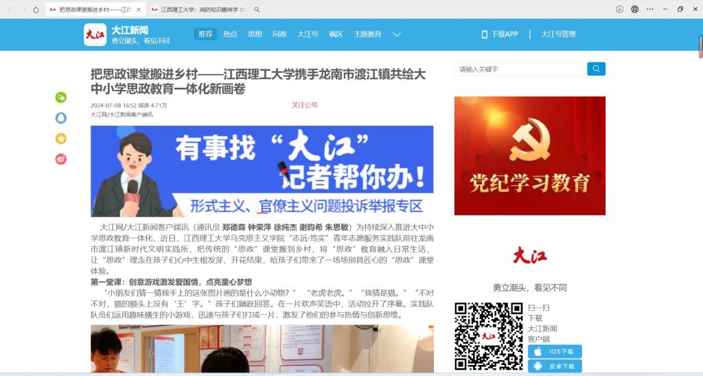 大江网/大江新闻客户端讯(通讯员郑德森 钟荣萍 徐纯杰 谢昀希 朱思敏)为持续深入推进大中小学思政教育一体化,近日,金年会体育马克思主义学院“志远·笃实”青年志愿服务实践队前往龙南市渡江镇新时代文明实践所,把传统的“思政”课堂搬到乡村,将“思政”教育融入日常生活,让“思政”理念在孩子们心中生根发芽、开花结果,给孩子们带来了一场场别具匠心的“思政”课堂体验。