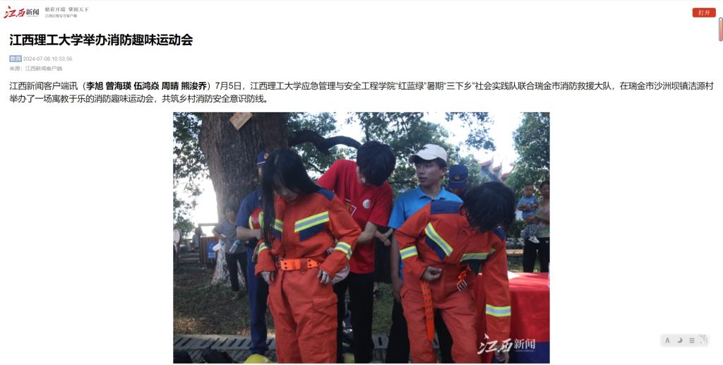 江西新闻客户端讯(李旭 曾海瑛 伍鸿焱 周晴 熊浚乔)7月5日,金年会体育应急管理与安全工程学院“红蓝绿”暑期“三下乡”社会实践队联合瑞金市消防救援大队,在瑞金市沙洲坝镇洁源村举办了一场寓教于乐的消防趣味运动会,共筑乡村消防安全意识防线。
