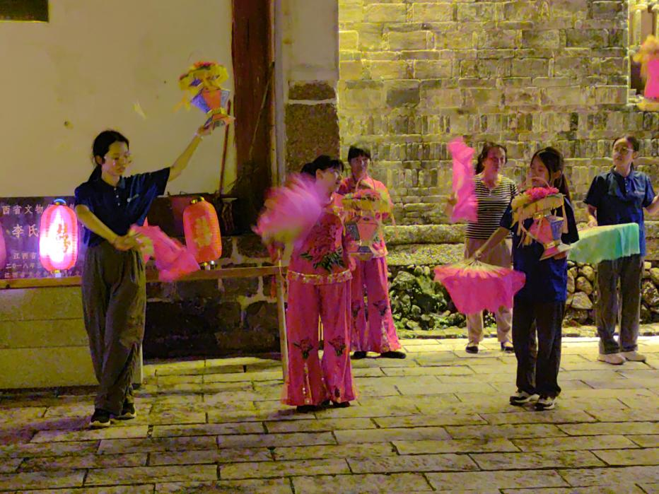 到了村民们最期待的“茶篮灯”表演环节,同学们与村内“茶篮灯”村民表演队“同台竞技”,唱起唱词,挥动彩扇,手托彩灯与观看的村民们不断互动。用最青春、最真挚的“茶篮灯”表演丰富着古村村民的精神文明世界,让“非遗”文化在青春唱跳中焕发崭新生命力。