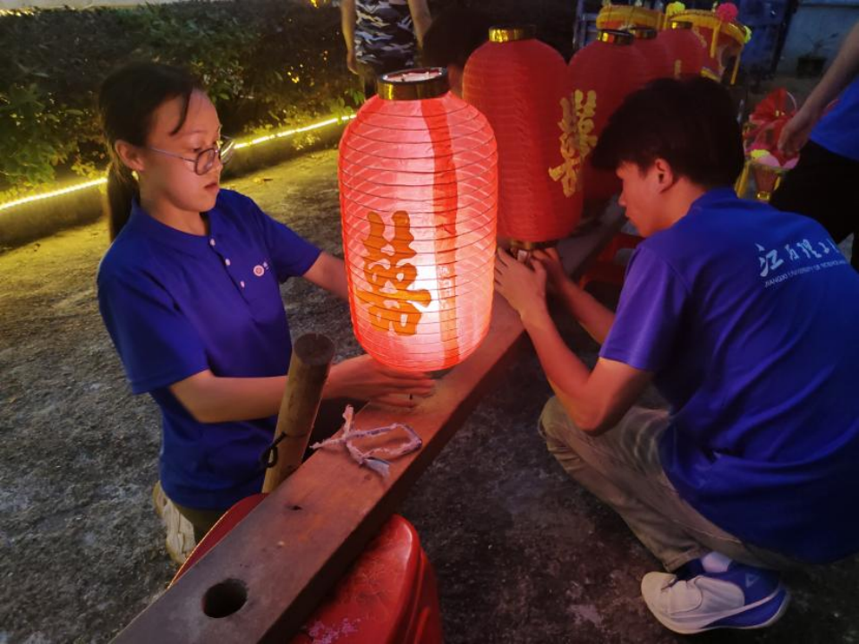 同学们从做桥梆做起,在村民指导下扎灯框、安灯光。从两两配合寸步难行到最后二十组桥梆灯张灯结彩,同学们从早忙到晚。傍晚十分,同学们敲起锣鼓,肩扛“桥梆灯”,从村头走到村尾,红色的灯笼蜿蜒而去犹如一条长龙。村民们欣赏着近年来最年轻的“桥梆灯”表演,不断为这些年轻的文化传承青年鼓掌喝彩。
