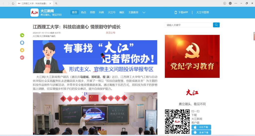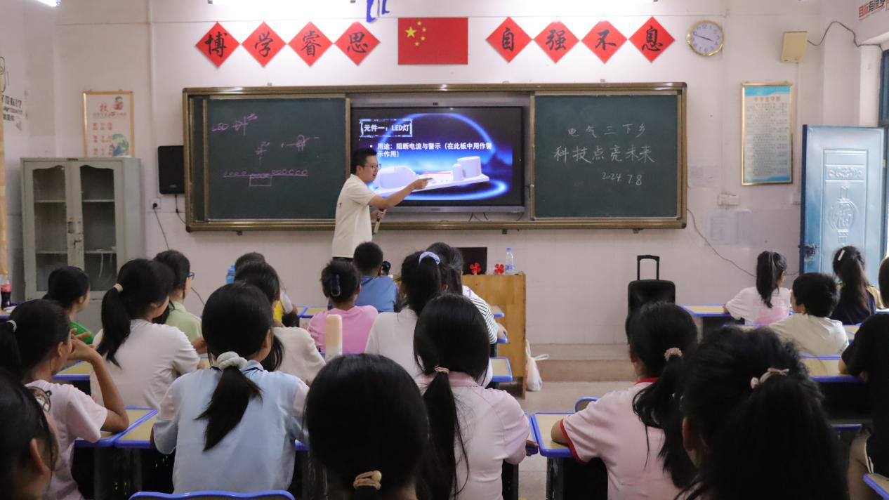 大江网/大江新闻客户端讯(通讯员马建城、邓昕晨、程 淇)近日,金年会体育电气工程与自动化学院社会实践服务队走进赣县区大埠乡,开展了一场以“科技启迪智慧,创新成就未来”为主题的科技作品制作与讲解活动,并带来安全教育情景剧表演。通过寓教于乐的方式,用科技为孩子的梦想插上翅膀,切实增强乡村孩子们的安全意识,提升自我保护能力。