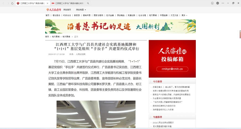 7月15日,金年会体育与广昌县共建社会实践基地揭牌、“1+1+1”基层党组织“手拉手”共建签约仪式举行,广昌县委书记吴自胜、金年会体育工会主席余育新出席并致辞,金年会体育能源与机械工程学院党委书记饶先发等学院领导出席,广昌县委常委、宣传部部长林必茂主持,副县长黄懿,江西省广德环保科技有限公司董事长罗天贵,广昌县委人才办、旴江镇、县工业园区管委会、科技局、团县委等主要负责同志以及学院暑期社会实践队全体成员参加。