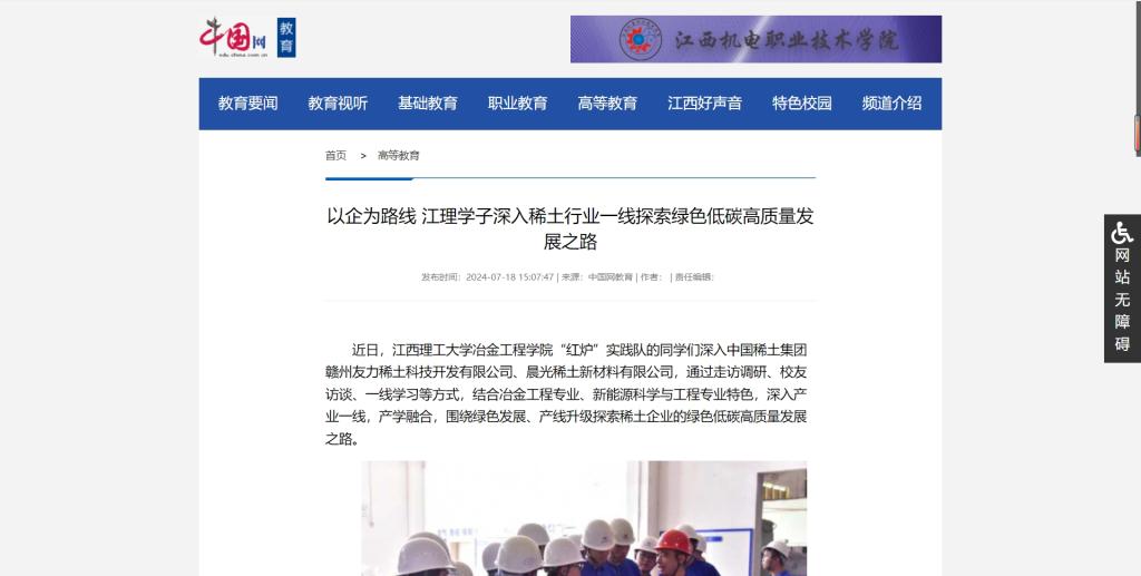 近日,金年会体育冶金工程学院“红炉”实践队的同学们深入中国稀土集团赣州友力稀土科技开发有限公司、晨光稀土新材料有限公司,通过走访调研、校友访谈、一线学习等方式,结合冶金工程专业、新能源科学与工程专业特色,深入产业一线,产学融合,围绕绿色发展、产线升级探索稀土企业的绿色低碳高质量发展之路。