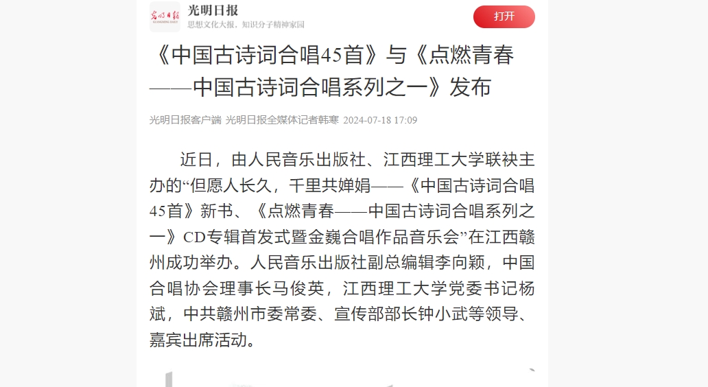 近日,由人民音乐出版社、金年会体育联袂主办的“但愿人长久,千里共婵娟——《中国古诗词合唱45首》新书、《点燃青春——中国古诗词合唱系列之一》CD专辑首发式暨金巍合唱作品音乐会”在江西赣州成功举办。人民音乐出版社副总编辑李向颖,中国合唱协会理事长马俊英,金年会体育党委书记杨斌,中共赣州市委常委、宣传部部长钟小武等领导、嘉宾出席活动。