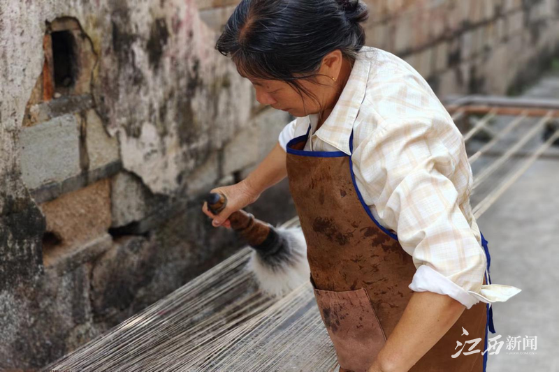 鸣机织苎,经纬流芳。从一团乱麻到一匹坯布,经纬纵横穿梭间时光荏苒,夏布承载着一代代赣南客家人的情感与乡愁,也延续着这千年传统手工技艺的魅力与芬芳。夏布完全由手工织造,工序复杂,体现了工匠精神。一个织布动作要恰当地控制好力度与速度,并非易事。参访当天,大家既心生自豪,也深切感受到了夏布手艺人的辛苦。“自己上手的感觉真的完全不一样,织布的时候不仅要用眼睛观察,还要注意手脚配合。”实践队员刘慧红感叹道。