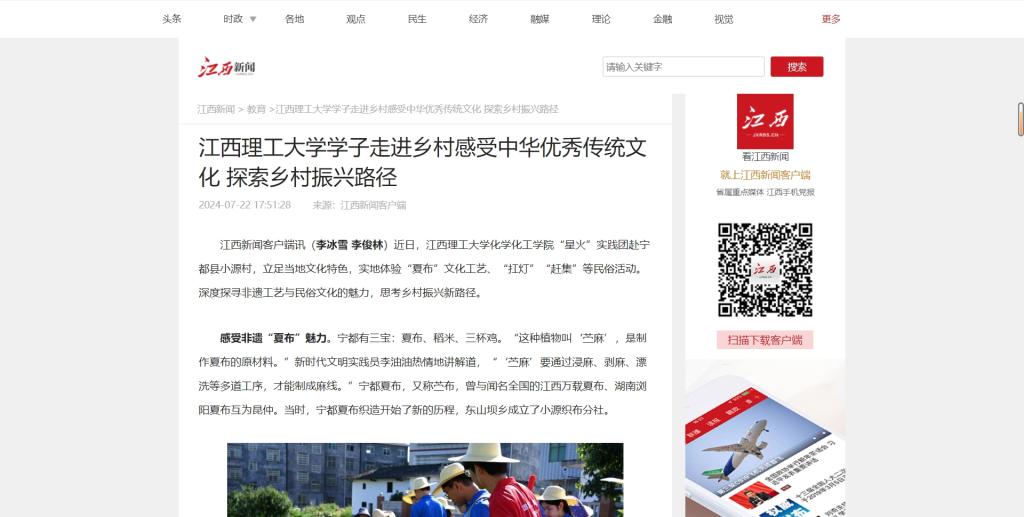 江西新闻客户端讯(李冰雪 李俊林)近日,金年会体育化学化工学院“星火”实践团赴宁都县小源村,立足当地文化特色,实地体验“夏布”文化工艺、“扛灯”“赶集”等民俗活动。深度探寻非遗工艺与民俗文化的魅力,思考乡村振兴新路径。