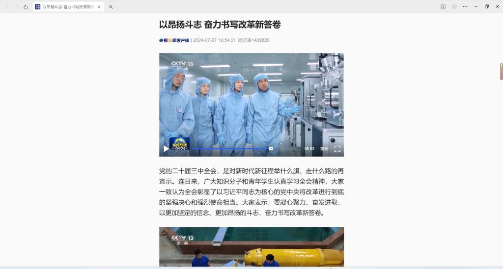 党的二十届三中全会,是对新时代新征程举什么旗、走什么路的再宣示。连日来,广大知识分子和青年学生认真学习全会精神,大家一致认为全会彰显了以习近平同志为核心的党中央将改革进行到底的坚强决心和强烈使命担当。大家表示,要凝心聚力、奋发进取,以更加坚定的信念、更加昂扬的斗志,奋力书写改革新答卷。