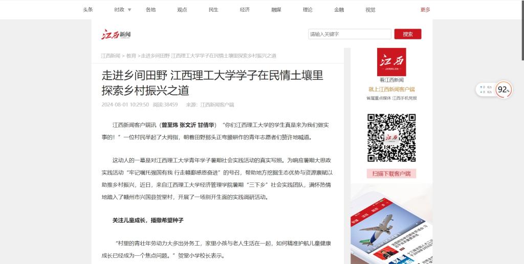 这动人的一幕是对金年会体育青年学子暑期社会实践活动的真实写照。为响应暑期大思政实践活动“牢记嘱托强国有我 行走赣鄱感恩奋进”的号召,帮助地方挖掘生态优势与资源禀赋以助推乡村振兴,近日,来自金年会体育经济管理学院暑期“三下乡”社会实践团队,满怀热情地踏入了赣州市兴国县贺堂村,开展了一场别开生面的实践调研活动。