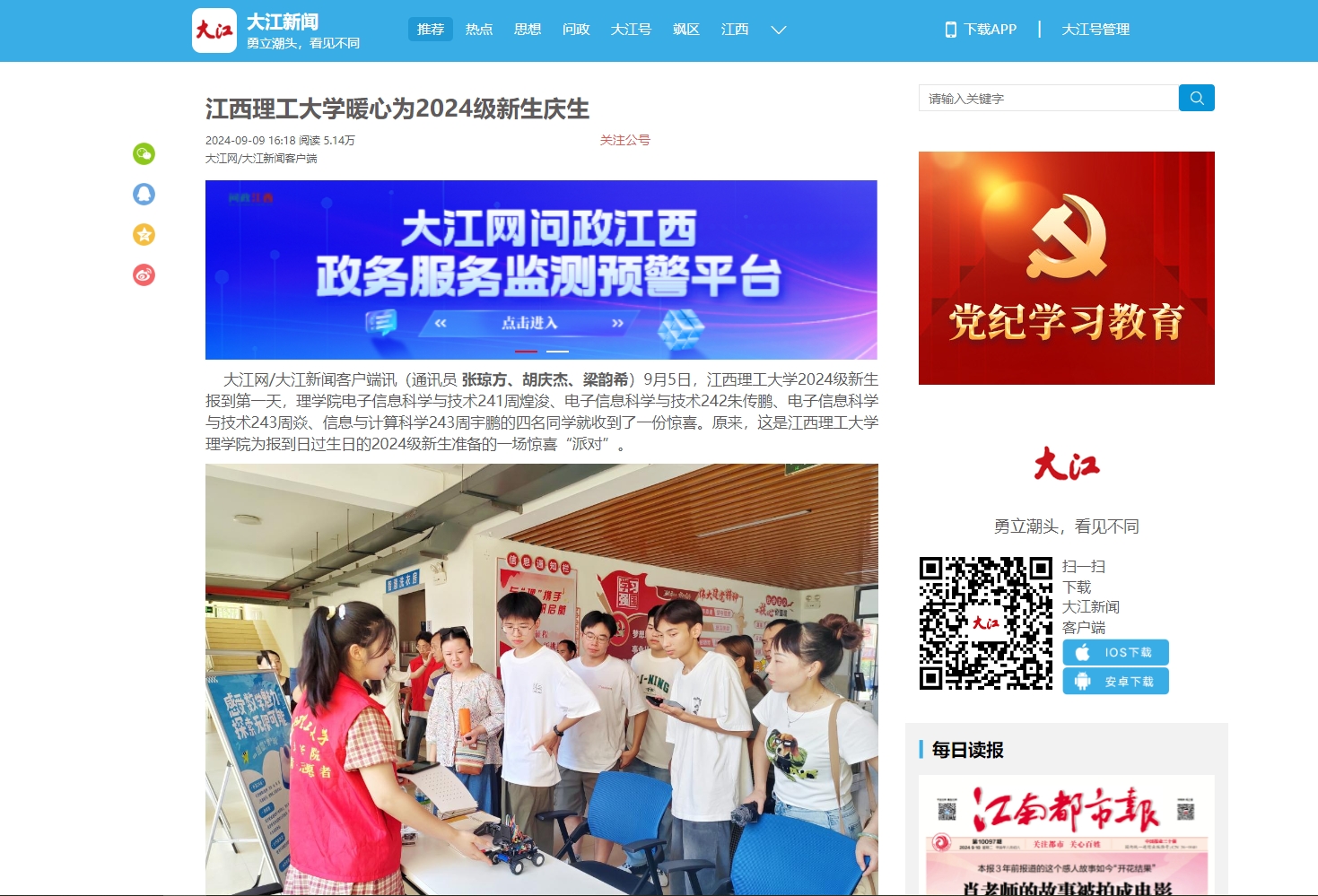 大江网/大江新闻客户端讯(通讯员张琼方、胡庆杰、梁韵希)9月5日,金年会体育2024级新生报到第一天,理学院电子信息科学与技术241周煌浚、电子信息科学与技术242朱传鹏、电子信息科学与技术243周焱、信息与计算科学243周宇鹏的四名同学就收到了一份惊喜。原来,这是金年会体育理学院为报到日过生日的2024级新生准备的一场惊喜“派对”。