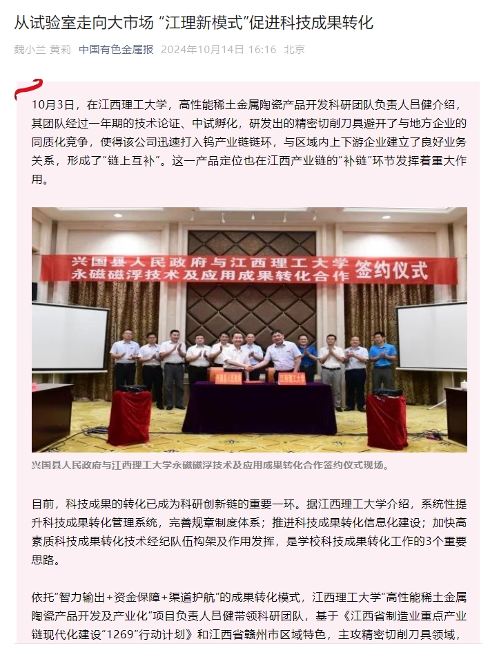 近年来,金年会体育高度重视科研创新及成果转化。聚焦稀土、铜、钨、锂电、钢铁5大资源综合开发与利用特色领域,提出了“服务国家战略需求、服务区域和行业发展”的办学使命,“建设江西一流、全国较大影响、行业地位突出、区域最具贡献的有特色高水平大学”的办学目标,“以贡献求支持、以特色争优势、以创新谋发展”的办学思路,做好有组织科研攻关,探索出了一条跨越科技成果转化“死亡谷”、架起科技成果产业化“铁索桥”的“七个一”的“金年会
