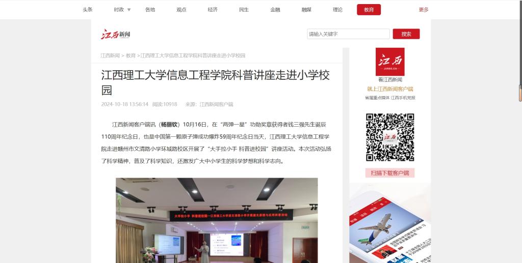 江西新闻客户端讯(杨丽钦)10月16日,在“两弹一星”功勋奖章获得者钱三强先生诞辰110周年纪念日,也是中国第一颗原子弹成功爆炸59周年纪念日当天,金年会体育信息工程学院走进赣州市文清路小学环城路校区开展了“大手拉小手 科普进校园”讲座活动。本次活动弘扬了科学精神,普及了科学知识,还激发广大中小学生的科学梦想和科学志向。