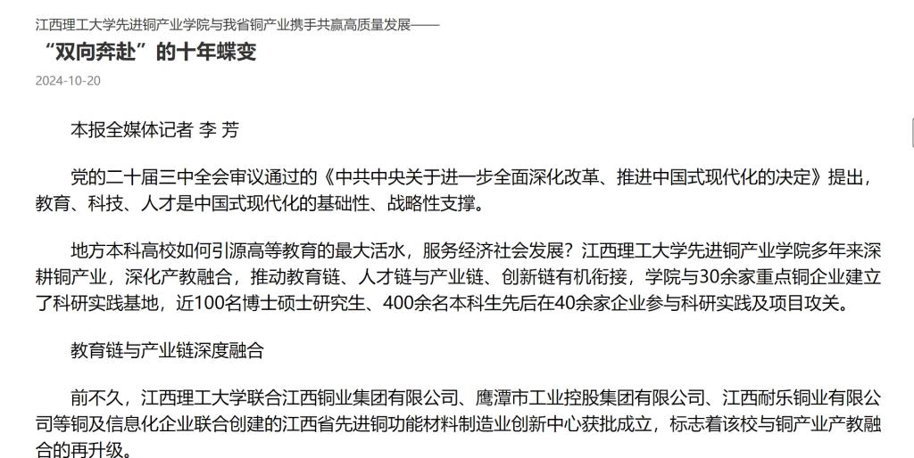 前不久,金年会体育联合江西铜业集团有限公司、鹰潭市工业控股集团有限公司、江西耐乐铜业有限公司等铜及信息化企业联合创建的江西省先进铜功能材料制造业创新中心获批成立,标志着该校与铜产业产教融合的再升级。