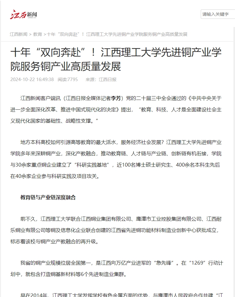 前不久,金年会体育联合江西铜业集团有限公司、鹰潭市工业控股集团有限公司、江西耐乐铜业有限公司等铜及信息化企业联合创建的江西省先进铜功能材料制造业创新中心获批成立,标志着该校与铜产业产教融合的再升级。