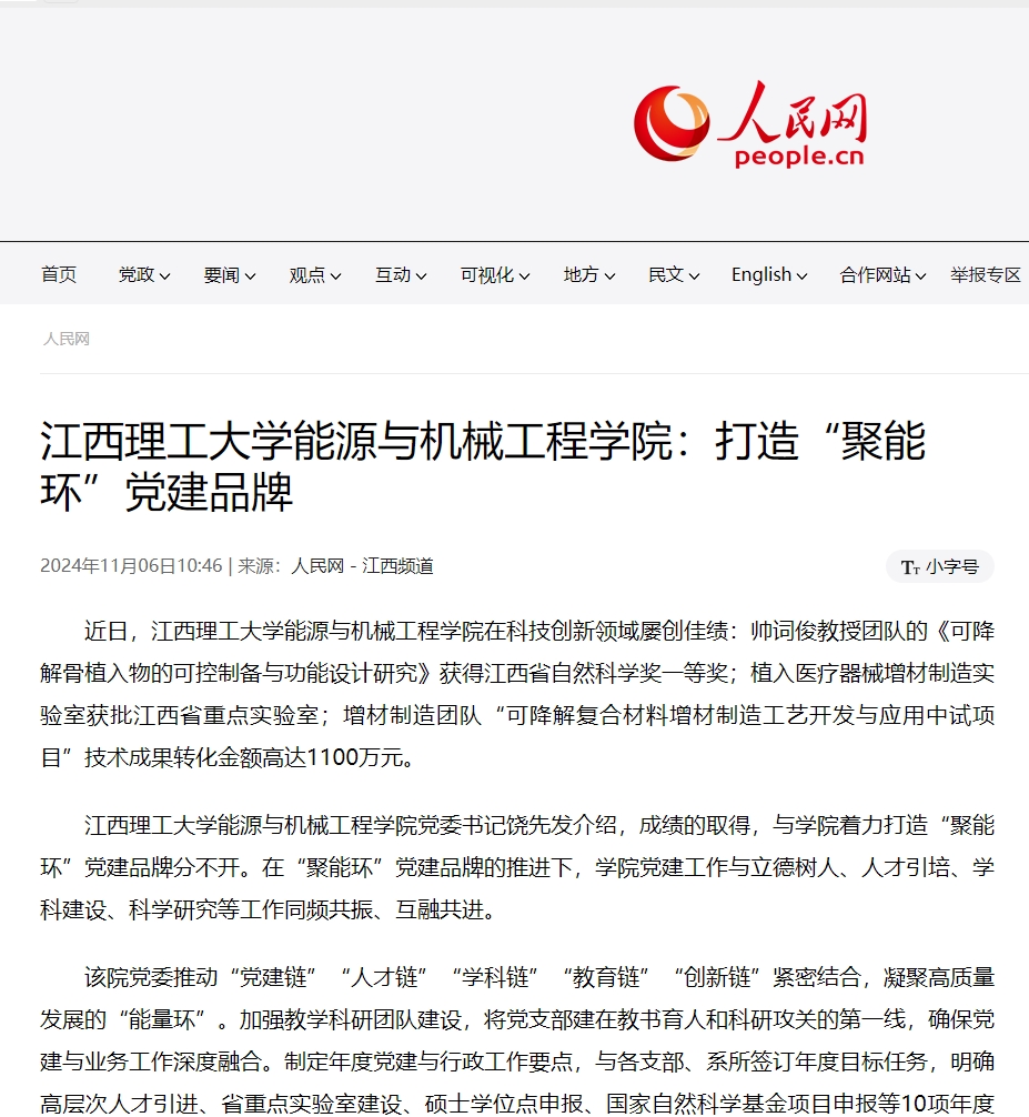近日,金年会体育能源与机械工程学院在科技创新领域屡创佳绩:帅词俊教授团队的《可降解骨植入物的可控制备与功能设计研究》获得江西省自然科学奖一等奖;植入医疗器械增材制造实验室获批江西省重点实验室;增材制造团队“可降解复合材料增材制造工艺开发与应用中试项目”技术成果转化金额高达1100万元。
