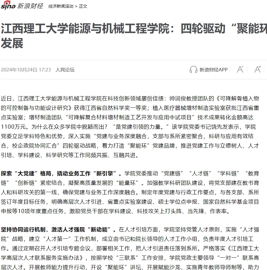 近日,金年会体育能源与机械工程学院在科技创新领域屡创佳绩:帅词俊教授团队的《可降解骨植入物的可控制备与功能设计研究》获得江西省自然科学奖一等奖;植入医疗器械增材制造实验室获批江西省重点实验室;增材制造团队“可降解复合材料增材制造工艺开发与应用中试项目”技术成果转化金额高达1100万元。为什么在众多学院中脱颖而出?“是党建引领的力量。”该学院党委书记饶先发表示,学院党委立足学科特色和优势,深入实施“党建与业务深度融合,支部与系所紧密聚合,科研与应用有效结合,校企政院协同汇合”四轮驱动战略,着力打造“聚能环”党建品牌,推进党建工作与立德树人、人才引培、学科建设、科学研究等工作同频共振、互融共进。
