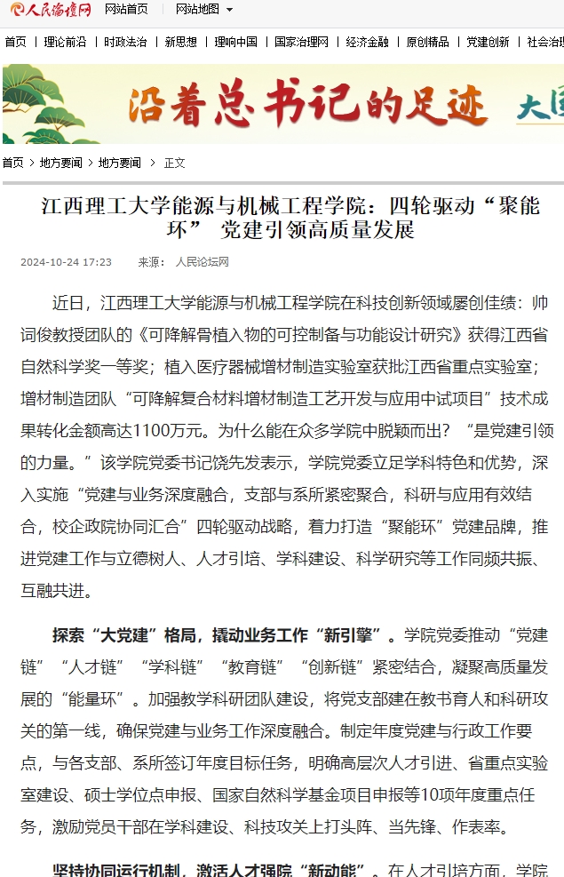 近日,金年会体育能源与机械工程学院在科技创新领域屡创佳绩:帅词俊教授团队的《可降解骨植入物的可控制备与功能设计研究》获得江西省自然科学奖一等奖;植入医疗器械增材制造实验室获批江西省重点实验室;增材制造团队“可降解复合材料增材制造工艺开发与应用中试项目”技术成果转化金额高达1100万元。为什么能在众多学院中脱颖而出?“是党建引领的力量。”该学院党委书记饶先发表示,学院党委立足学科特色和优势,深入实施“党建与业务深度融合,支部与系所紧密聚合,科研与应用有效结合,校企政院协同汇合”四轮驱动战略,着力打造“聚能环”党建品牌,推进党建工作与立德树人、人才引培、学科建设、科学研究等工作同频共振、互融共进。