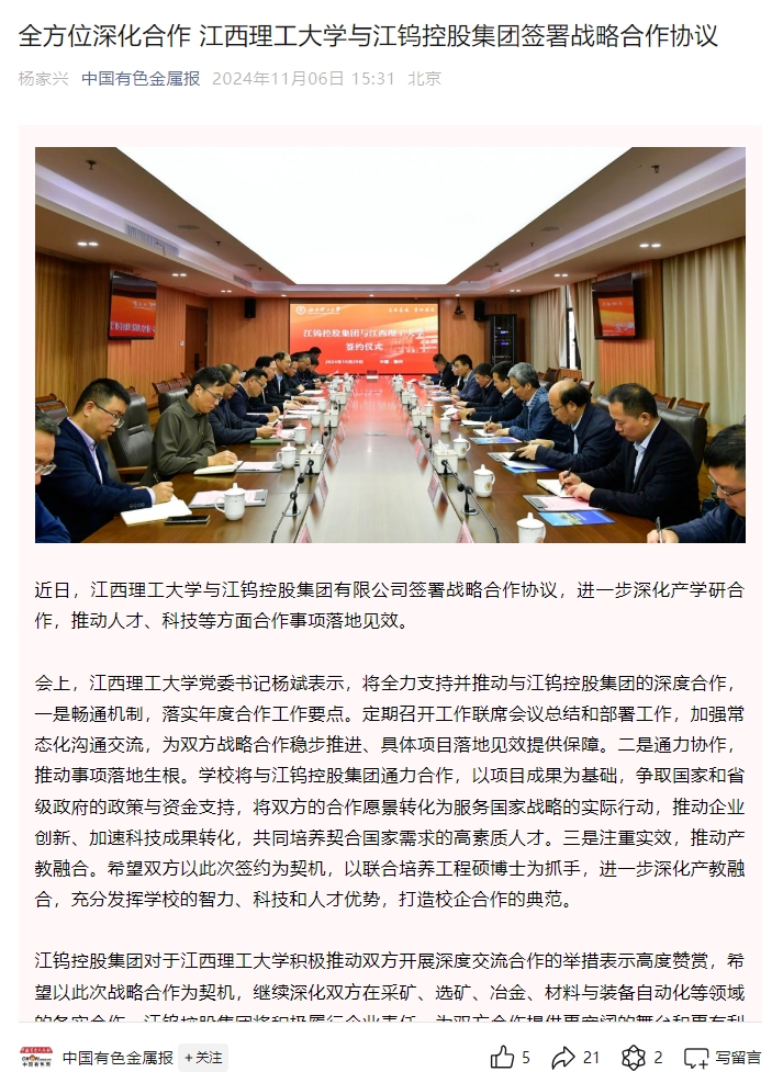 江钨控股集团对于金年会体育积极推动双方开展深度交流合作的举措表示高度赞赏,希望以此次战略合作为契机,继续深化双方在采矿、选矿、冶金、材料与装备自动化等领域的务实合作。江钨控股集团将积极履行企业责任,为双方合作提供更宽阔的舞台和更有利的条件,推动双方资源整合和优势互补,推进产学研用协同发展,创造校企合作共赢、共谋发展的良好局面。