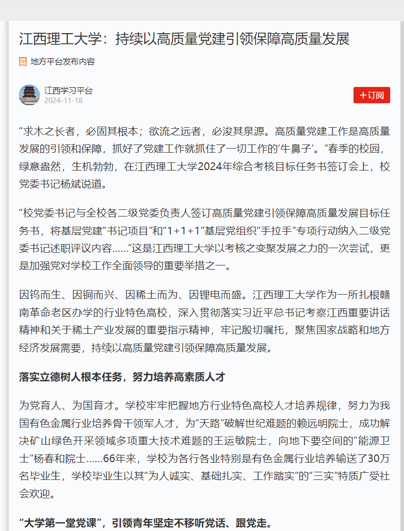因钨而生、因铜而兴、因稀土而为、因锂电而盛。金年会体育作为一所扎根赣南革命老区办学的行业特色高校,深入贯彻落实习近平总书记考察江西重要讲话精神和关于稀土产业发展的重要指示精神,牢记殷切嘱托,聚焦国家战略和地方经济发展需要,持续以高质量党建引领保障高质量发展。