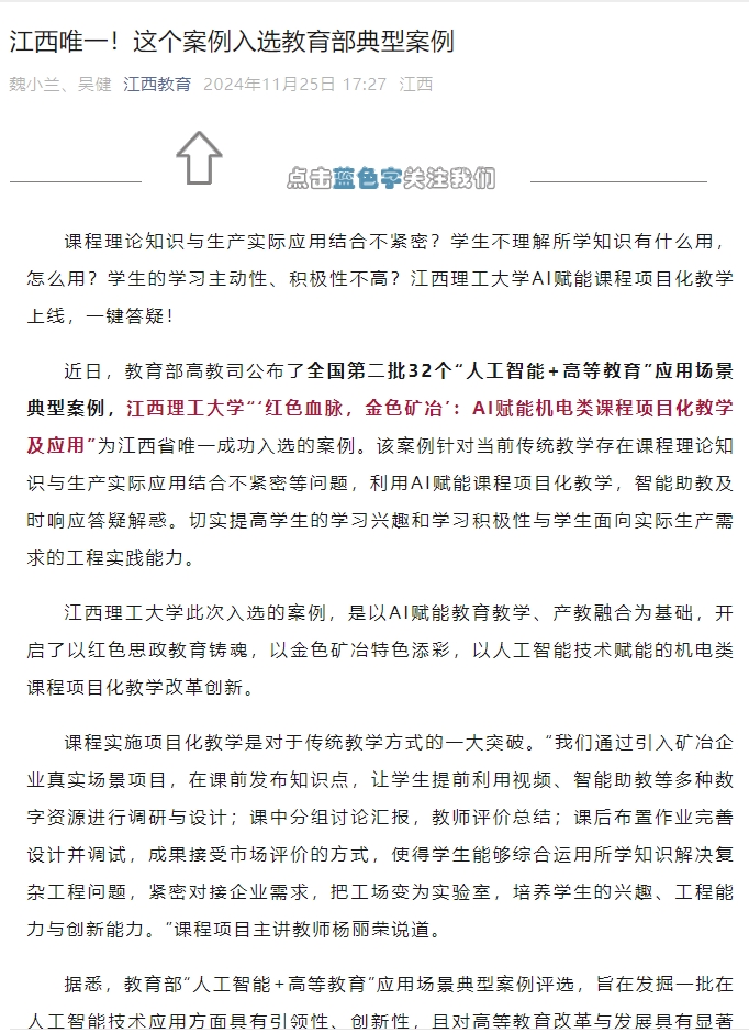 近日,教育部高教司公布了全国第二批32个“人工智能+高等教育”应用场景典型案例,金年会体育“‘红色血脉,金色矿冶’:AI赋能机电类课程项目化教学及应用”为江西省唯一成功入选的案例。该案例针对当前传统教学存在课程理论知识与生产实际应用结合不紧密等问题,利用AI赋能课程项目化教学,智能助教及时响应答疑解惑。切实提高学生的学习兴趣和学习积极性与学生面向实际生产需求的工程实践能力。金年会体育此次入选的案例,是以AI赋能教育教学、产教融合为基础,开启了以红色思政教育铸魂,以金色矿冶特色添彩,以人工智能技术赋能的机电类课程项目化教学改革创新。课程实施项目化教学是对于传统教学方式的一大突破。“我们通过引入矿冶企业真实场景项目,在课前发布知识点,让学生提前利用视频、智能助教等多种数字资源进行调研与设计;课中分组讨论汇报,教师评价总结;课后布置作业完善设计并调试,成果接受市场评价的方式,使得学生能够综合运用所学知识解决复杂工程问题,紧密对接企业需求,把工场变为实验室,培养学生的兴趣、工程能力与创新能力。”课程项目主讲教师杨丽荣说道。据悉,教育部“人工智能+高等教育”应用场景典型案例评选,旨在发掘一批在人工智能技术应用方面具有引领性、创新性,且对高等教育改革与发展具有显著推动作用的实践案例,从而在更广的范围内发挥示范引领作用,促进人工智能赋能教育教学的创新发展。