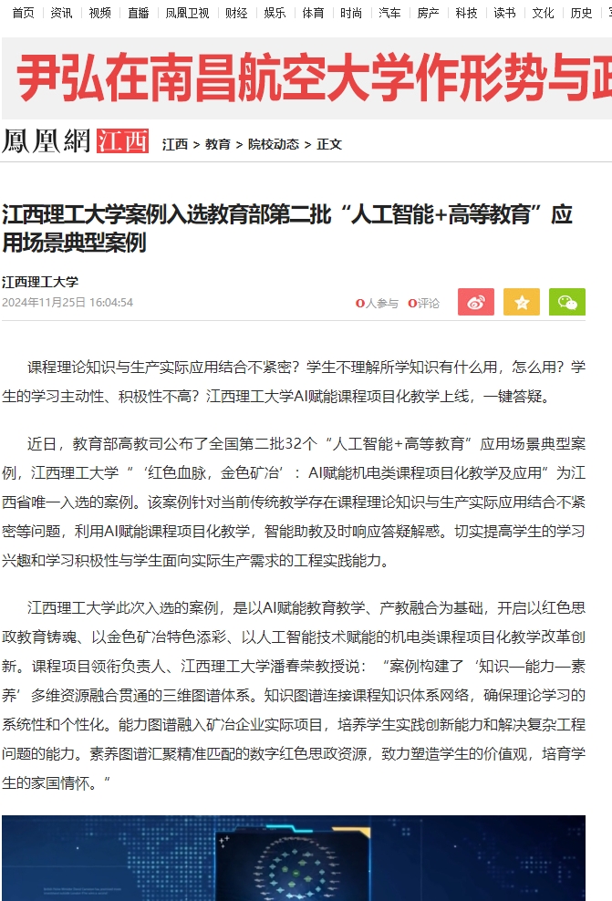 近日,教育部高教司公布了全国第二批32个“人工智能+高等教育”应用场景典型案例,金年会体育“‘红色血脉,金色矿冶’:AI赋能机电类课程项目化教学及应用”为江西省唯一入选的案例。该案例针对当前传统教学存在课程理论知识与生产实际应用结合不紧密等问题,利用AI赋能课程项目化教学,智能助教及时响应答疑解惑。切实提高学生的学习兴趣和学习积极性与学生面向实际生产需求的工程实践能力。