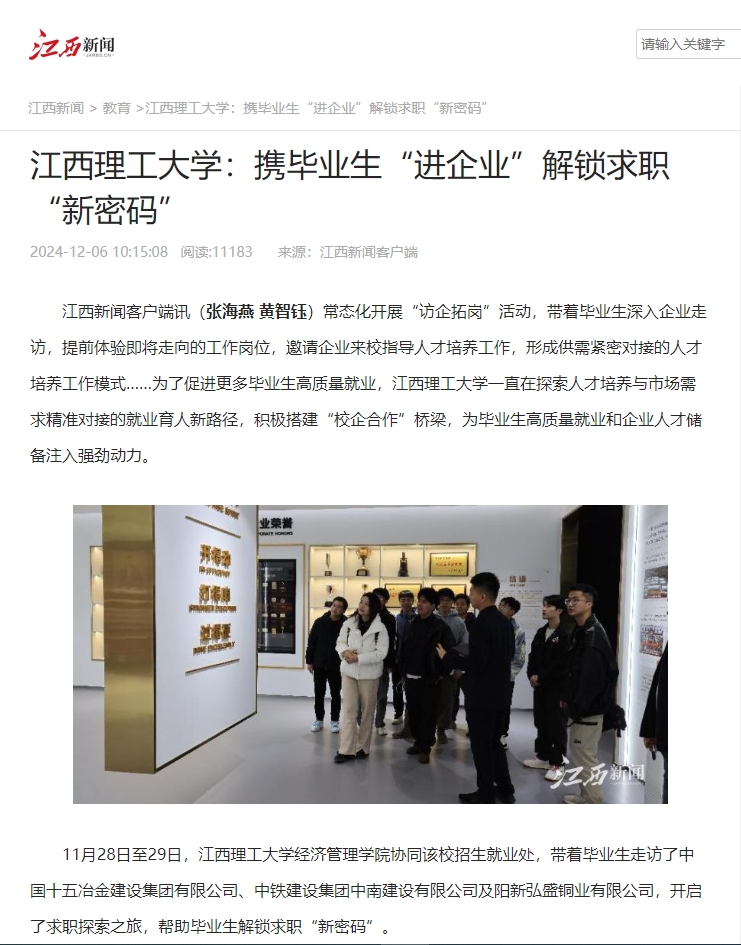11月28日至29日,金年会体育经济管理学院协同该校招生就业处,带着毕业生走访了中国十五冶金建设集团有限公司、中铁建设集团中南建设有限公司及阳新弘盛铜业有限公司,开启了求职探索之旅,帮助毕业生解锁求职“新密码”。