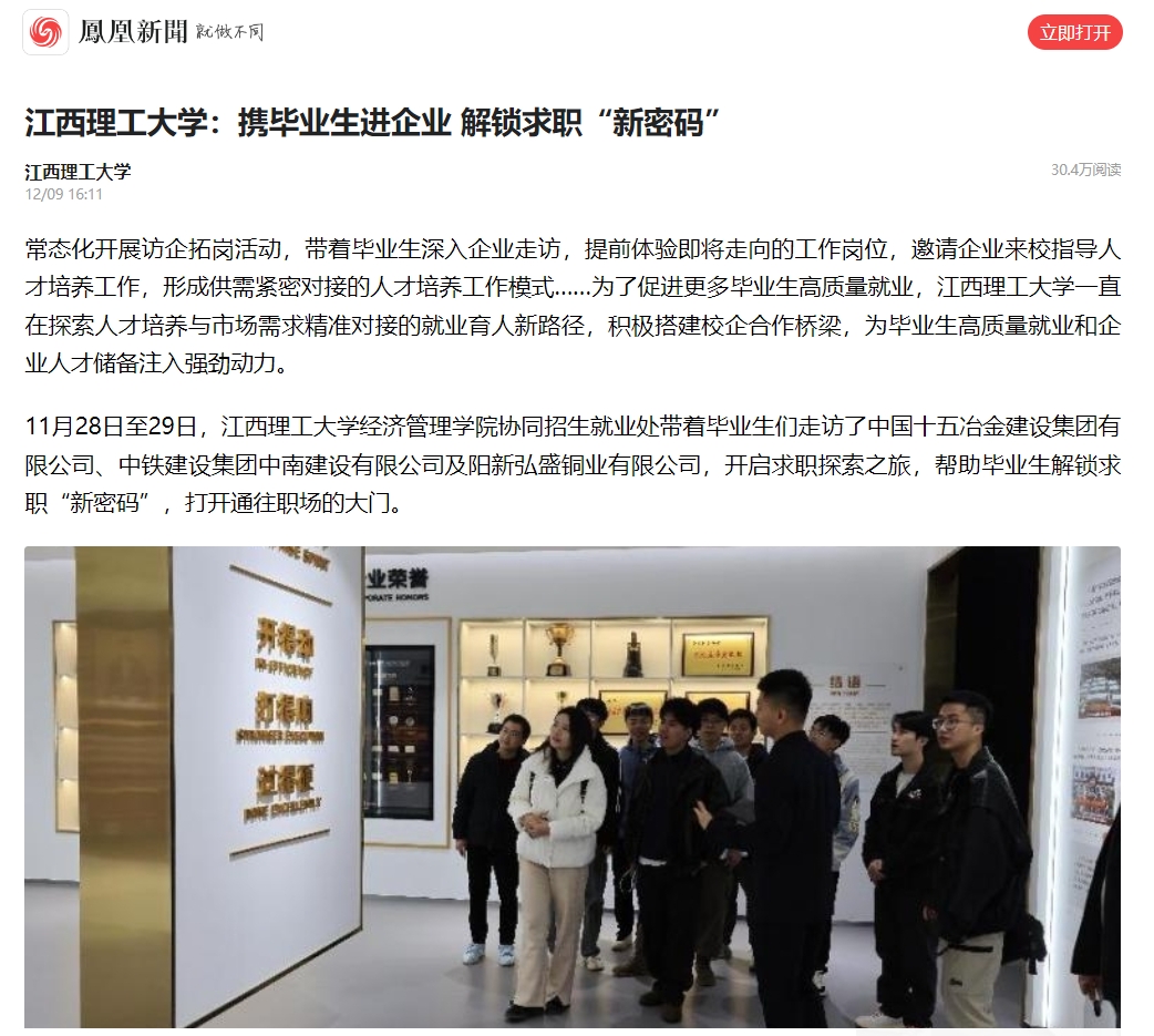 11月28日至29日,金年会体育经济管理学院协同招生就业处带着毕业生们走访了中国十五冶金建设集团有限公司、中铁建设集团中南建设有限公司及阳新弘盛铜业有限公司,开启求职探索之旅,帮助毕业生解锁求职“新密码”,打开通往职场的大门。