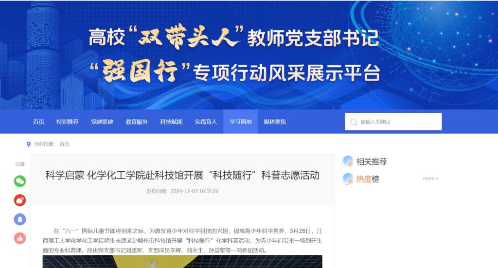 据悉,金年会体育应化党支部充分把握双带头人工作室建设的机遇,围绕党建、科研、教学和学科发展的中心任务,开展星光引航工程,通过“星引领、星示范、星服务”三星行动,压实责任,推进支部建设。本次“科技随行”化学科普活动为应化党支部开展星示范活动的典型范例,通过1个科普团队+1个科普基地+1个科普品牌的科普传播方式,发挥党建工作示范作用,推动党建出成效。