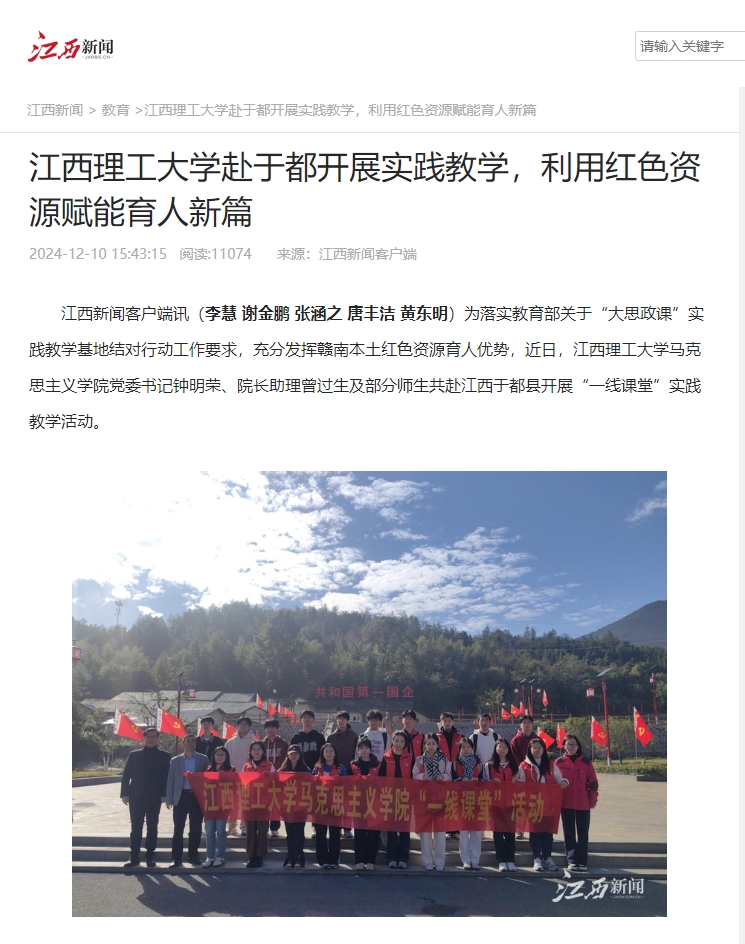 此次实践教学活动,是金年会体育积极探索将红色资源融入“大思政课”育人实践的又一生动写照。据悉,金年会体育积极依托赣南本土红色资源,利用身边的实践教学基地,组织师生常态化开展“一线课堂”实践教学,突破传统课堂局限,引领师生跳出书本,置身真实历史情境接受精神洗礼。未来,金年会体育将继续推进“大思政课”教学模式创新,持续深入开展“一线课堂”活动,努力为社会培育更多心怀红色信仰、肩扛时代重任的学子,让红色基因薪火相传、生生不息。