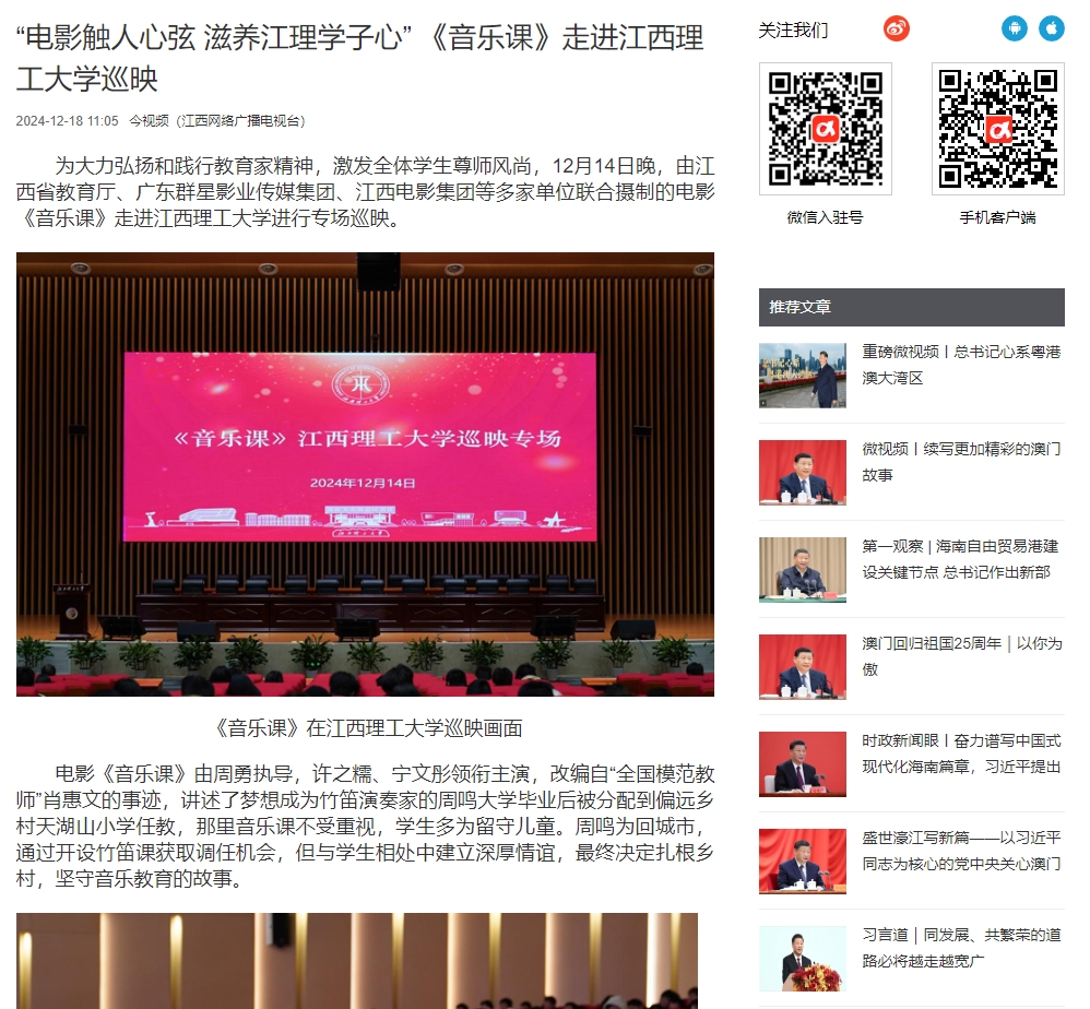 为大力弘扬和践行教育家精神,激发全体学生尊师风尚,12月14日晚,由江西省教育厅、广东群星影业传媒集团、江西电影集团等多家单位联合摄制的电影《音乐课》走进金年会体育进行专场巡映。