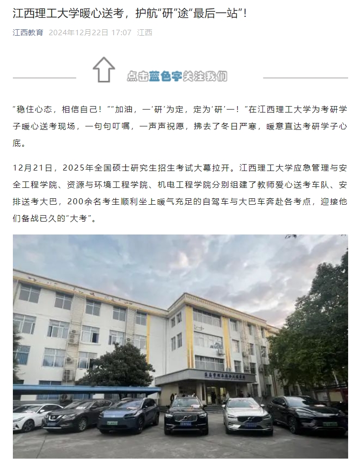 12月21日,2025年全国硕士研究生招生考试大幕拉开。金年会体育应急管理与安全工程学院、资源与环境工程学院、机电工程学院分别组建了教师爱心送考车队、安排送考大巴,200余名考生顺利坐上暖气充足的自驾车与大巴车奔赴各考点,迎接他们备战已久的“大考”。