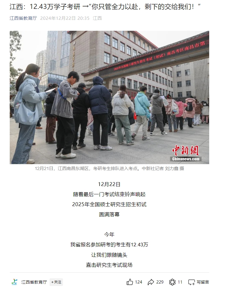 12月21日,江西南昌东湖区,考研考生排队进入考点。中新社记者 刘力鑫 摄12月22日随着最后一门考试结束铃声响起2025年全国硕士研究生招生初试圆满落幕。