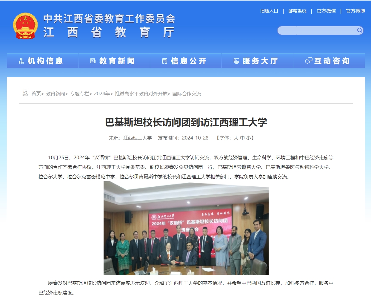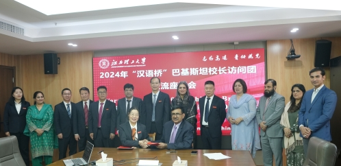 10月25日,2024年“汉语桥”巴基斯坦校长访问团到金年会体育访问交流,双方就经济管理、生命科学、环境工程和中巴经济走廊等方面的合作签署合作协议。金年会体育党委常委、副校长廖春发会见访问团一行。巴基斯坦旁遮普大学、巴基斯坦兽医与动物科学大学、拉合尔大学、拉合尔克雷桑模范中学、拉合尔贝肯豪斯中学的校长和金年会体育相关部门、学院负责人参加座谈交流。