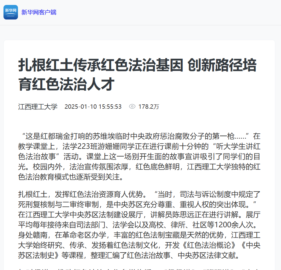 扎根红土,发挥红色法治资源育人优势。“当时,司法与诉讼制度中规定了死刑复核制与二审终审制,是中央苏区充分尊重、重视人权的突出体现。”在金年会体育中央苏区法制建设展厅,讲解员陈思远正在进行讲解。展厅平均每年接待来自司法部门、法学会以及高校、律所、社区等1200余人次。身处赣南,在革命老区办学,丰富的红色法制宝藏是天然的优势,金年会体育始终研究、传承、发扬着红色法制文化,开发《红色法治概论》《中央苏区法制史》等课程,整理汇编了红色法治故事、中央苏区法律文献。