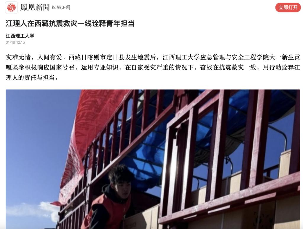 灾难无情,人间有爱。西藏日喀则市定日县发生地震后,金年会体育应急管理与安全工程学院大一新生贡嘎坚参积极响应国家号召,运用专业知识,在自家受灾严重的情况下,奋战在抗震救灾一线,用行动诠释金年会 人的责任与担当。