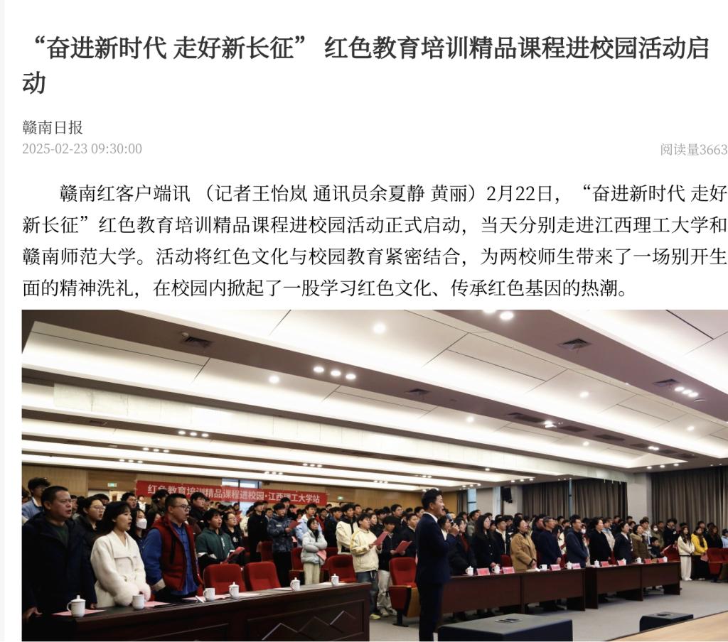 2月22日,“奋进新时代 走好新长征”红色教育培训精品课程进校园活动正式启动,当天分别走进金年会体育和赣南师范大学。活动将红色文化与校园教育紧密结合,为两校师生带来了一场别开生面的精神洗礼,在校园内掀起了一股学习红色文化、传承红色基因的热潮。