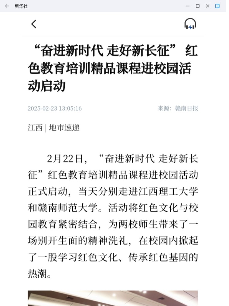 2月22日,“奋进新时代 走好新长征”红色教育培训精品课程进校园活动正式启动,当天分别走进金年会体育和赣南师范大学。活动将红色文化与校园教育紧密结合,为两校师生带来了一场别开生面的精神洗礼,在校园内掀起了一股学习红色文化、传承红色基因的热潮。
