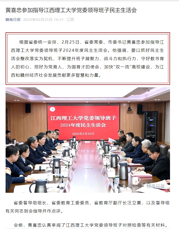 党委领导班子2024年度民主生活会。他强调,要以抓好民主生活会整改落实为契机,不断提升班子凝聚力、战斗力和执行力,守好教书育人的初心,担好为党育人、为国育才的使命,加快“双一流”高校建设,为江西和赣州经济社会发展贡献更多智慧和力量。