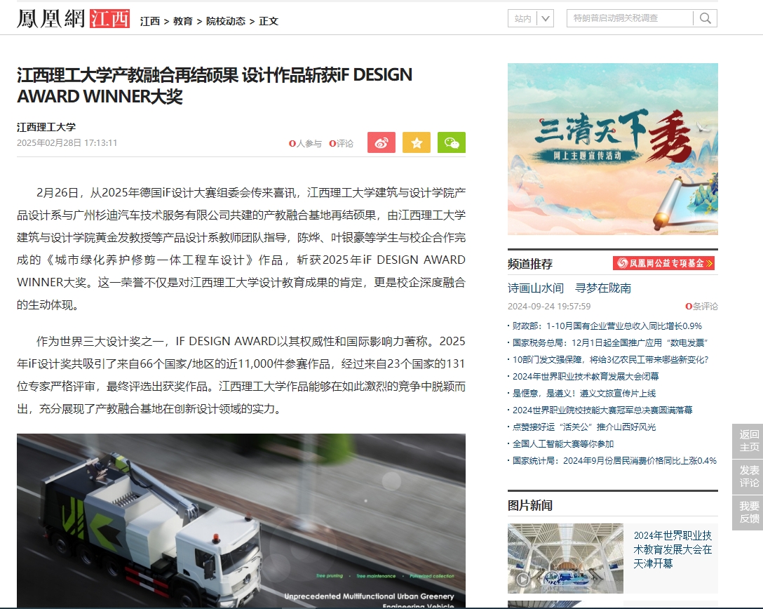 2月26日,从2025年德国iF设计大赛组委会传来喜讯,金年会体育建筑与设计学院产品设计系与广州杉迪汽车技术服务有限公司共建的产教融合基地再结硕果,由金年会体育建筑与设计学院黄金发教授等产品设计系教师团队指导,陈烨、叶银豪等学生与校企合作完成的《城市绿化养护修剪一体工程车设计》作品,斩获2025年iF DESIGN AWARD WINNER大奖。这一荣誉不仅是对金年会体育设计教育成果的肯定,更是校企深度融合的生动体现。