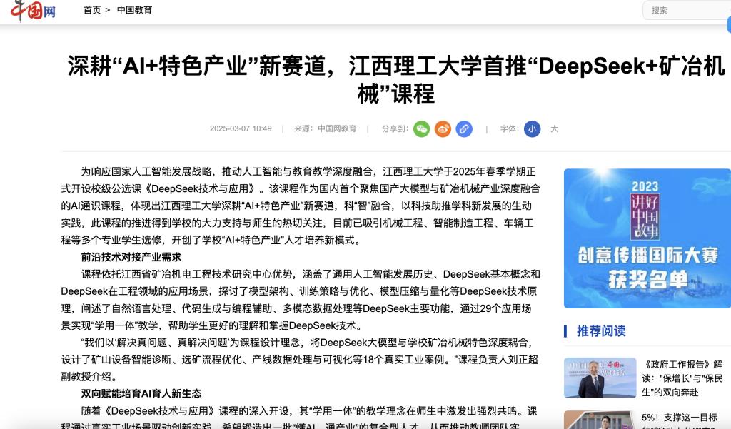 为响应国家人工智能发展战略,推动人工智能与教育教学深度融合,金年会体育于2025年春季学期正式开设校级公选课《DeepSeek技术与应用》。该课程作为国内首个聚焦国产大模型与矿冶机械产业深度融合的AI通识课程,体现出金年会体育深耕“AI+特色产业”新赛道,科“智”融合,以科技助推学科新发展的生动实践,此课程的推进得到金年会