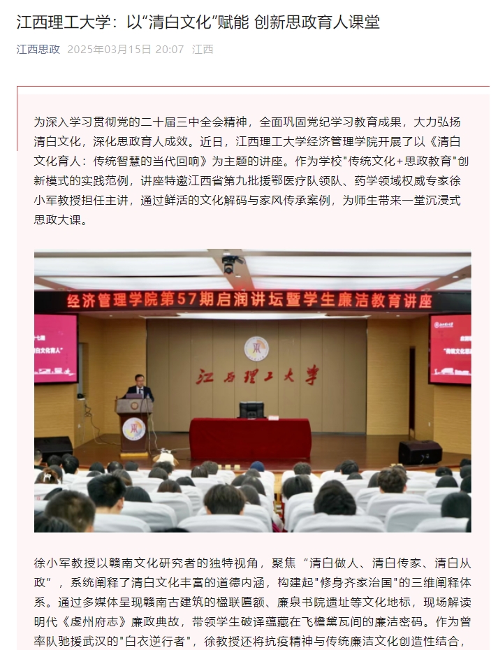 徐小军教授以赣南文化研究者的独特视角,聚焦“清白做人、清白传家、清白从政”,系统阐释了清白文化丰富的道德内涵,构建起"修身齐家治国"的三维阐释体系。通过多媒体呈现赣南古建筑的楹联匾额、廉泉书院遗址等文化地标,现场解读明代《虔州府志》廉政典故,带领学生破译蕴藏在飞檐黛瓦间的廉洁密码。作为曾率队驰援武汉的"白衣逆行者",徐教授还将抗疫精神与传统廉洁文化创造性结合,提出"当代青年三原色"育人理念:以红色基因筑牢信仰,用白色象征守护职业操守,借青色寓意永葆成长活力。