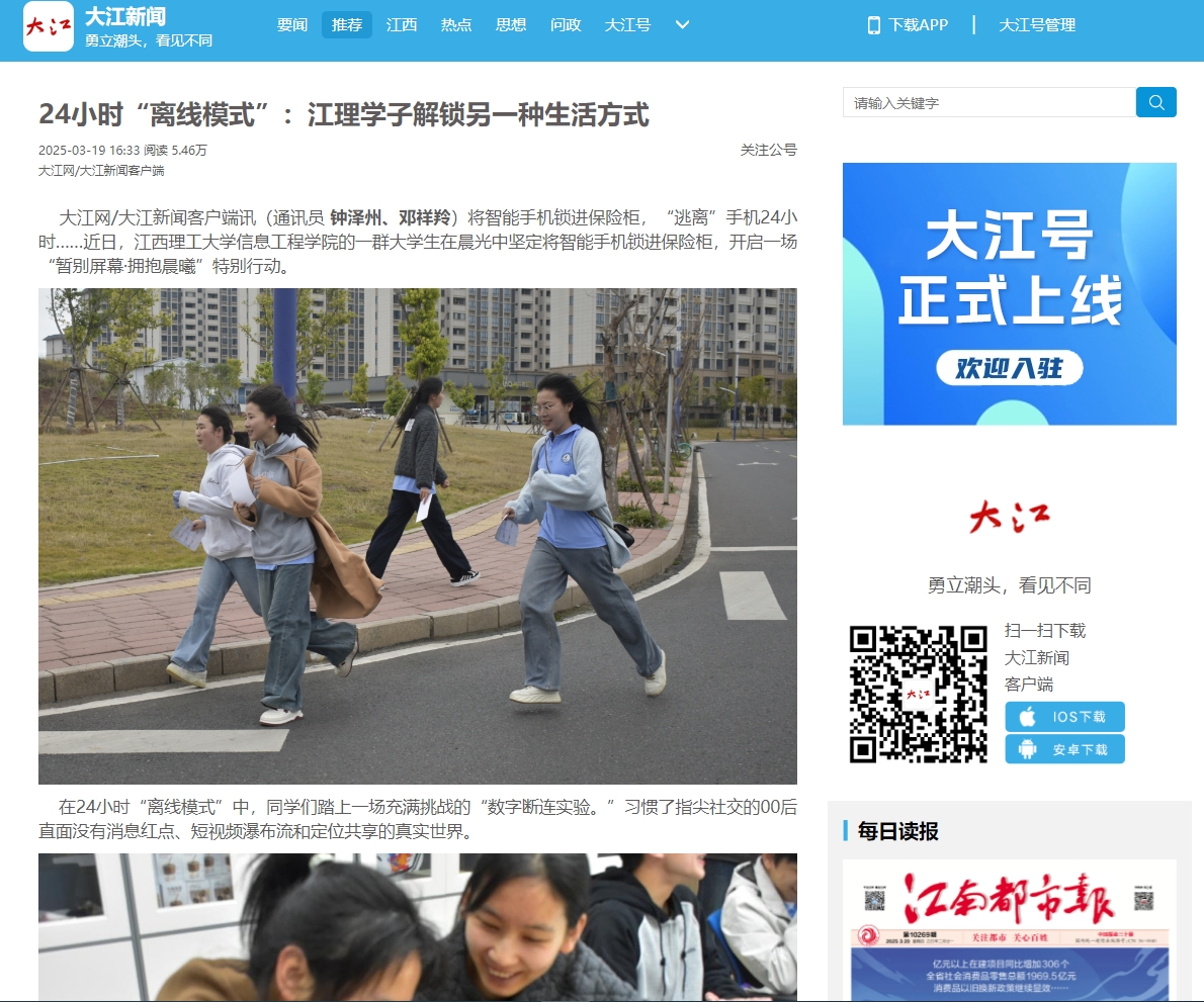 大江网/大江新闻客户端讯(通讯员钟泽州、邓祥羚)将智能手机锁进保险柜,“逃离”手机24小时……近日,金年会体育信息工程学院的一群大学生在晨光中坚定将智能手机锁进保险柜,开启一场“暂别屏幕·拥抱晨曦”特别行动。