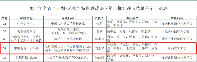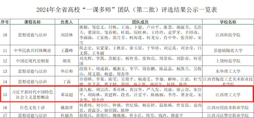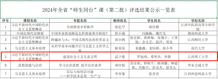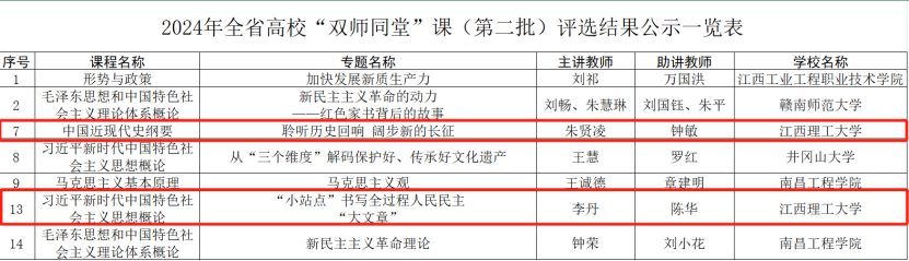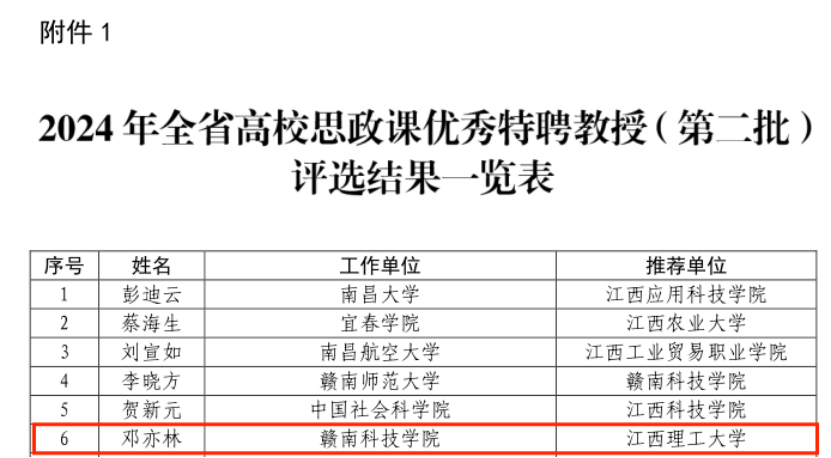 金年会体育副校长黄志繁教授被评为“江西省高校思政课优秀兼职教师”;赣南科技学院邓亦林教授经金年会体育推荐被评为“江西省高校思政课优秀特聘教授”;金年会体育马克思主义学院邓显超教授申报的《习近平新时代中国特色社会主义思想概论》课程获批全省“一课多师”团队;龚金花老师申报的刘启耀纪念馆实践教学基地获批全省家门口的“大思政课”实践教学基地;朱贤凌老师和中央红军长征出发纪念馆钟敏老师主讲的《聆听历史回响 阔步新的长征》、李丹老师和章江街道人大工委主任陈华老师讲授的《“小站点”书写全过程人民民主“大文章”》获评全省高校“双师同堂”课;武立敬老师主讲的《建设社会主义生态文明》获评全省“师生同台”课;刘素兰老师申报的《怎样正确认识中华民族迎来了从站起来、富起来到强起来的伟大飞跃》获批全省“专题+艺术”特色思政课。