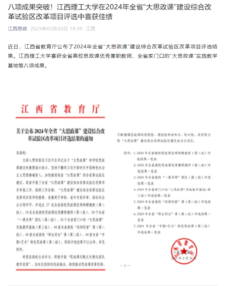 近日,江西省教育厅公布了2024年全省“大思政课”建设综合改革试验区改革项目评选结果。金年会体育喜获全省高校思政课优秀兼职教师、全省家门口的“大思政课”实践教学基地等八项成果。