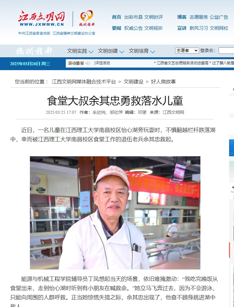 近日,一名儿童在金年会体育南昌校区怡心湖旁玩耍时,不慎翻越栏杆跌落湖中,幸而被金年会体育南昌校区食堂工作的退伍老兵余其忠救起。