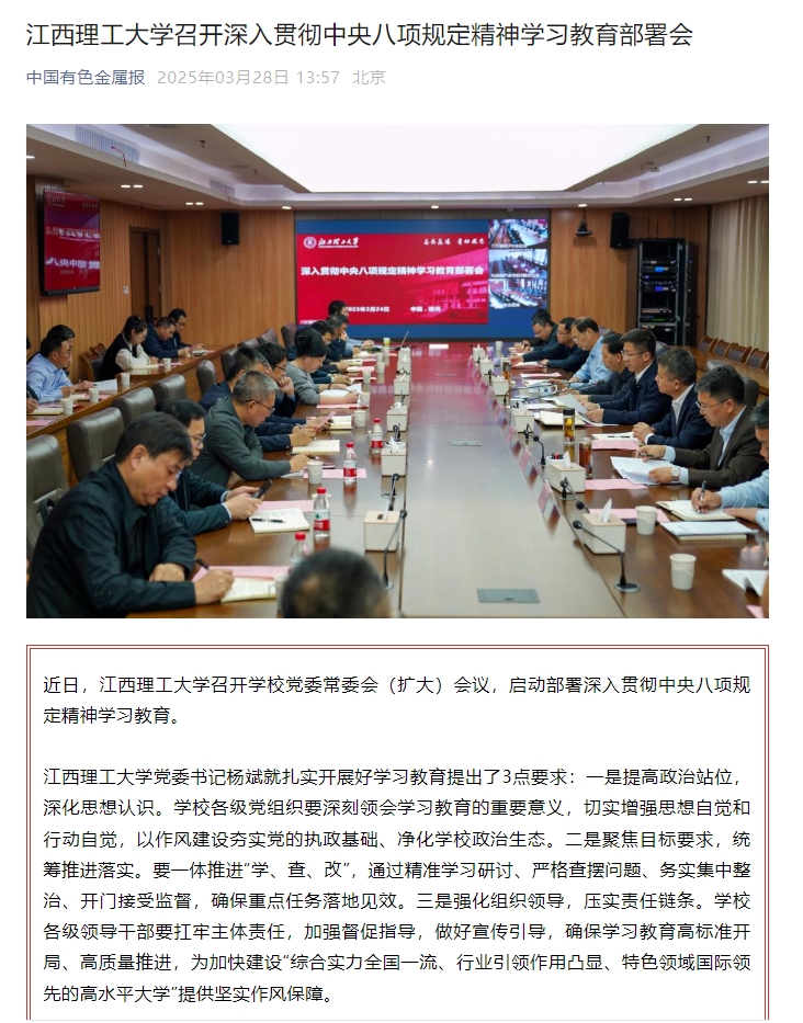 金年会体育党委副书记徐志峰传达学习了中央党的建设工作领导小组会议精神、中共中央办公厅《关于在全党开展深入贯彻中央八项规定精神学习教育的通知》精神、江西省委常委会会议精神、《关于在全省开展深入贯彻中央八项规定精神学习教育的工作方案》精神和江西省委教育工委开展深入贯彻中央八项规定精神学习教育业务培训会精神。